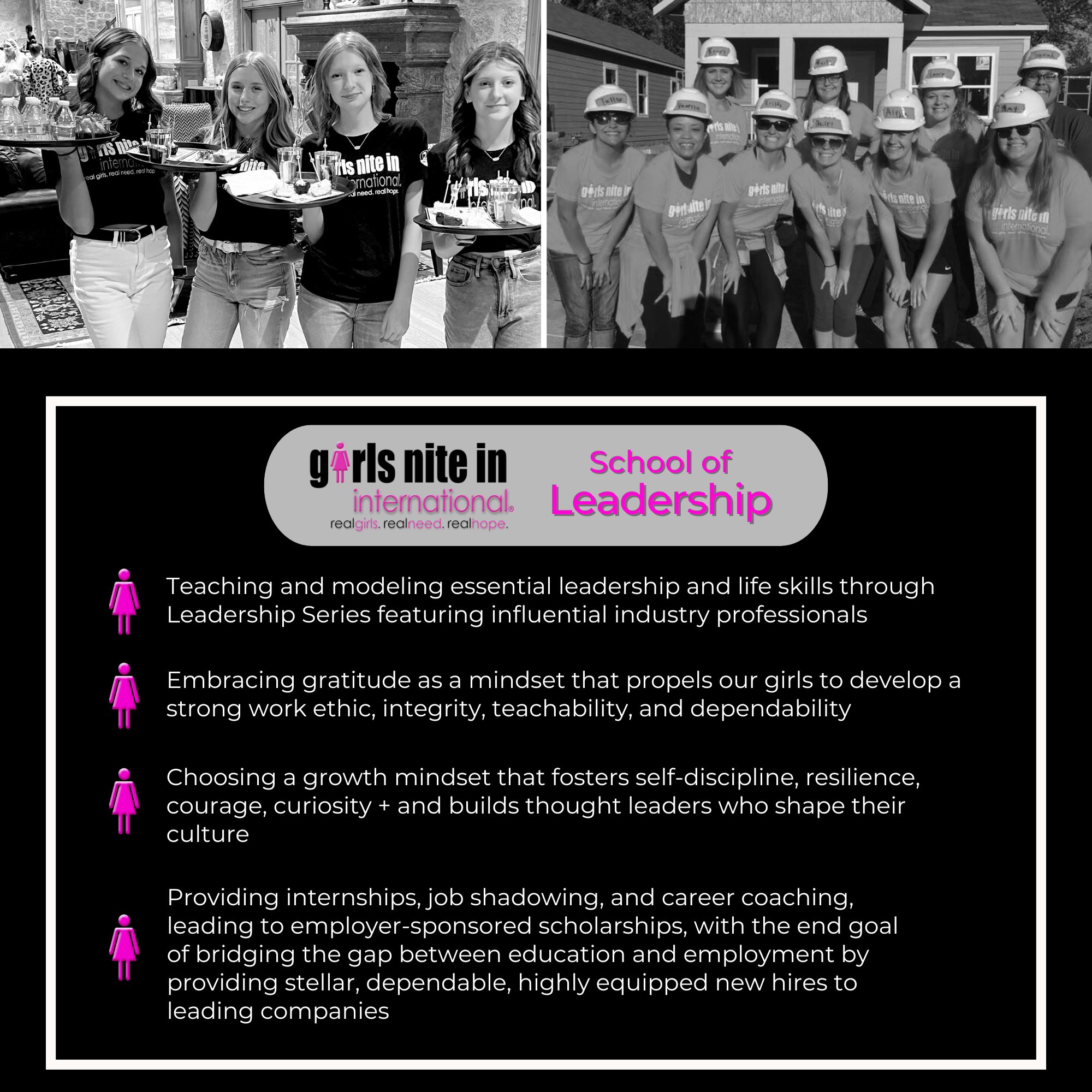 The Girls Nite In International School of Leadership exists to develop strong, bold, courageous, and compassionate leaders of the next generation! Teen girls who regularly attend our GNI Events can register for our School of Leadership program which includes academic tutoring, volunteer opportunities, life-skill training, speaking opportunities, career coaching and shadowing, and reimbursement for extra-curricular activities.